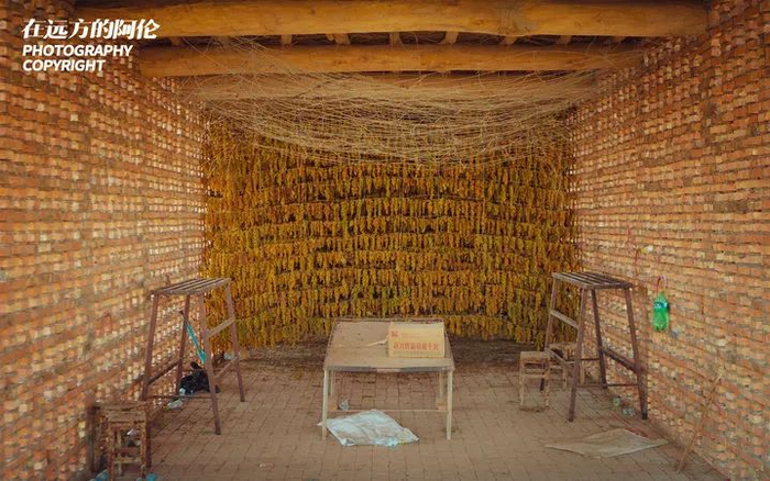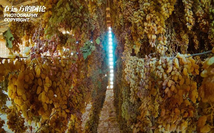 新鲜葡萄从新疆维吾尔自治区吐鲁番市高昌区胜金乡被采摘之后,就会运送到戈壁上的荫房里。它们被浸泡到呈碱性的催干剂30秒后,果皮表面的蜡和角质层被破坏,果肉水分能更快地从果皮上蒸发。
