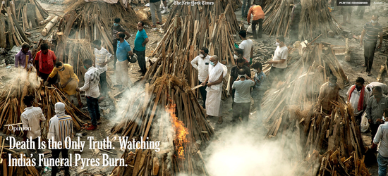 新德里东部有个加济布尔火葬场。火葬场的停车场很小,但如今却摆满了尸体,一具尸体一个柴火堆,密集程度甚至能达到一把火全烧了的地步。白天,这些尸体被一具具安置在各自的柴堆里,等到晚上点火。其他火葬场,尤其是那些有电或煤气的,现在每天从日出烧到日落。