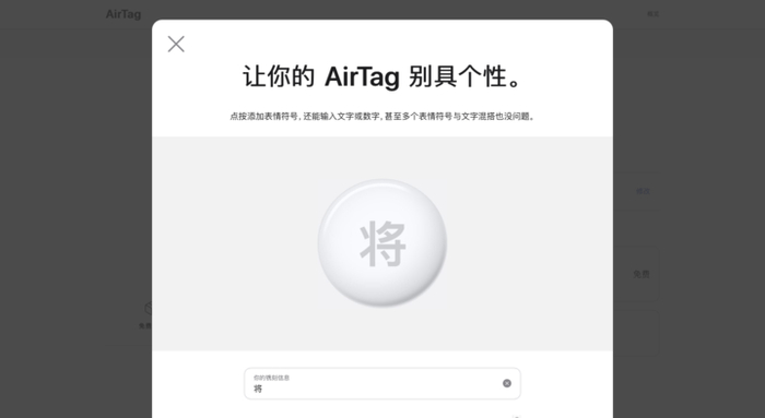 在选购 AirTag 的时候,可以免费刻字,最多能可接受 4 个字符(汉字、字母、数字、表情符号均算作一个字符)。若你恰巧财力雄厚,可以买 32 个 AirTag,再刻上象棋的字符,应该挺炫酷的。