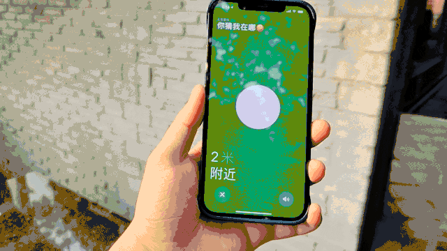站在 AirTag 的下方,手机依旧显示还有 2 米的距离,但无法给出具体的方向信息,只显示在“附近”。