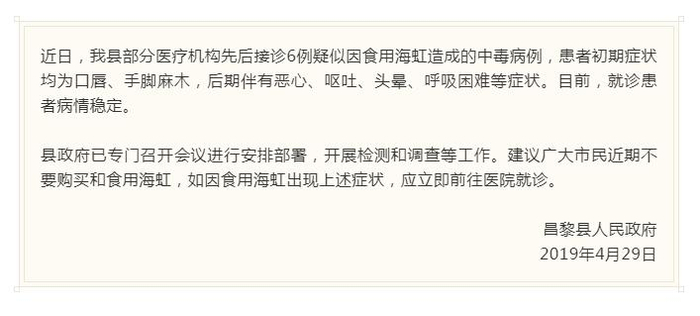 根据河北省水产技术推广总站和秦皇岛市海洋和渔业局近期检测结果显示,贻贝麻痹性贝类毒素含量已经超出安全限量标准2.0倍以上,如果食用极易引起中毒,会导致人出现四肢肌肉麻痹、头痛恶心、发烧皮疹等症状,严重的会导致呼吸停止。为防止海虹中毒事件的发生,提醒广大市民近期不要采集、买卖、食用海虹。一旦发生食用海虹出现中毒症状后,应立即赶往医院就诊。