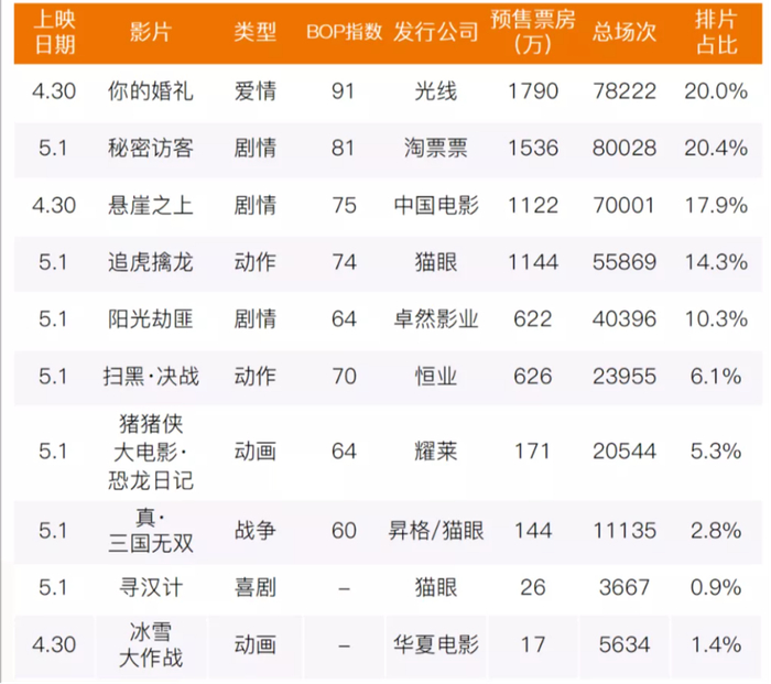 首映日排片方面,4月30日上映的《你的婚礼》《悬崖之上》分别达到42.2%、20.3%;5月1日上映的《秘密访客》、《扫黑·决战》、《追虎擒龙》分别达到20%、6%、14.4%。