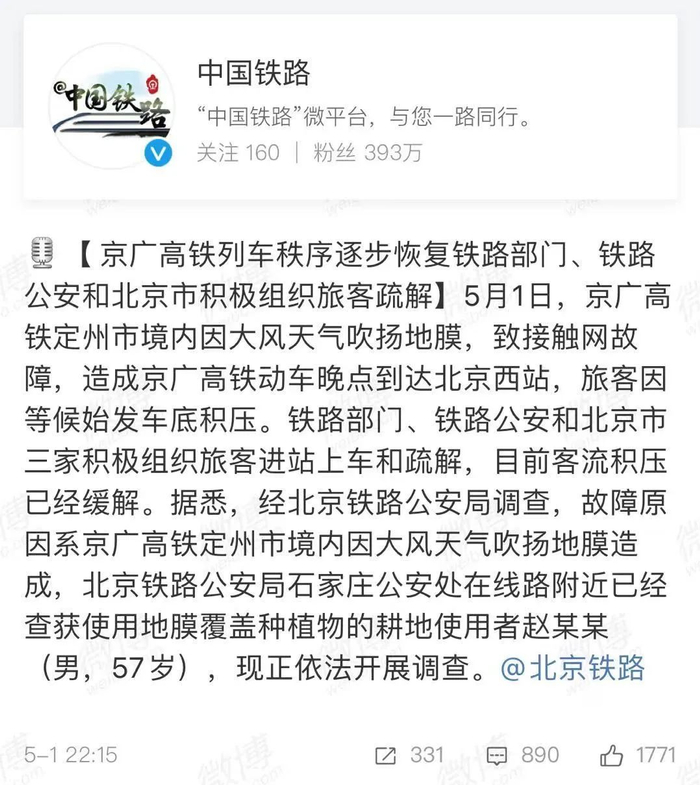 5月1日22时15分,@中国铁路发布最新情况通报: