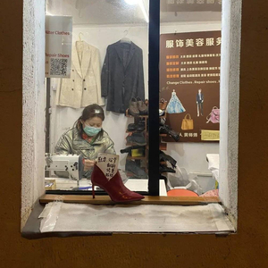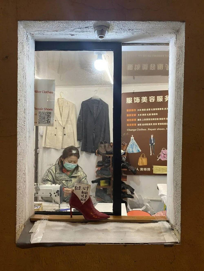 黄阿姨从2000年出头开始开店,原来开在五原路,2015年前后才搬到乌鲁木齐中路。我从店铺右边的弄堂口拐进矮房,拉开一扇白色小门,正对着女孩刚刚换位置的区域。没人换衣服时,帘子便打开,店面显得更宽阔一些。缝纫机正对着窗,旁边是熨衣服的台子,上面密密麻麻挂着衣服。黄阿姨告诉我,最开始她做的是裁缝店,从2007年“马爸爸”开始做生意以后,来裁缝店做衣服的人越来越少,索性就全部做衣服修改的活计。搬到乌中路以后,她跑到广州去学了修鞋和修包,又开辟了新的业务。店里的招牌中文均配上英文,黄阿姨有不少外国客户。