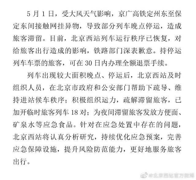 5月2日下午,北京西站官方微博在公告中称,“针对在应急处置中存在的问题,北京西站将认真分析研究,持续优化应急预案,完善应急保障设施,提升风险防范能力,更好地服务旅客出行”。