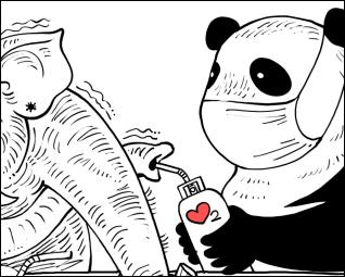 画面左侧的大象一副病恹恹的姿态,正发着高烧颤抖着,他的右手紧撰着扎满了针的熊猫玩偶,而左手正握着一把匕首,在桌子中央用力刻下一道歪曲的“三八线”。作为大象的同桌,戴着口罩的熊猫双手捧着标有爱心的氧气瓶,积极为重病的大象吸氧施予援手。值得注意的是,尽管大象摆出了一副并不情愿的表情,而他的鼻子依然绕过左手臂,通过一根吸管呼吸着熊猫提供的“爱心氧气”。