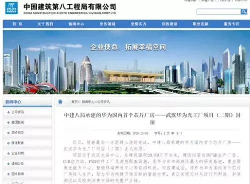 这让人联想起了去年11月30日在武汉封顶的华为武汉光芯片工厂项目,位于武汉光谷中心,看下图中建八局的官网,一切尽在不言中,不过这个要形成收入预计要在今年下半年或者2022年了。