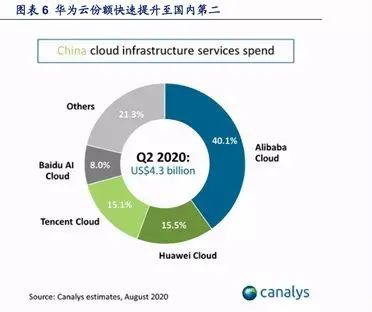 华为的云业务目前在国内市场的占有率已经仅次于阿里,因此以后是有很大的发展空间的,下图来自Canalys,华为云2020年Q2的15.5%的国内市场占有率仅次于阿里,该季度大约6.7亿美元,这样算华为云业务2020年营收已经在百亿人民币以上。