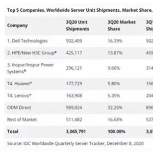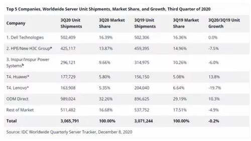 另外企业业务也是类似的,就以服务器发货为例子,下图是IDC发布的2020年第三季度全球服务器发货量,华为发货17.77万台。