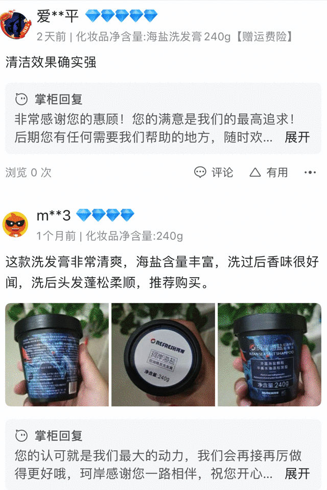 海盐颗粒清洁力度比普通洗发膏强很多,冲洗干净之后后觉得头发有些许涩感,这是正常现象。