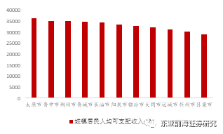 从人均GDP来看,山西各地级市人均GDP也表现为省会独强的特征。2019年太原市人均GDP为90,421元,而第二名为朔州市,人均GDP为59,269元。但山西各地市城镇居民人均可支配收入相差不大,多在3.5万左右,低于2019年全国城镇居民人均可支配收入42,359元。