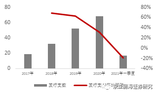 从城投企业发行来看,山西地区城投企业发行支数、规模从2017年起逐年增加。2021年一季度山西城投企业共发行17支债券、募集规模为158.7亿元,与2020年的21支、规模99.4亿元性比,募集规模同比上升59.66%,2021年山西城投发行规模发行处于历史较高水平。