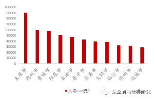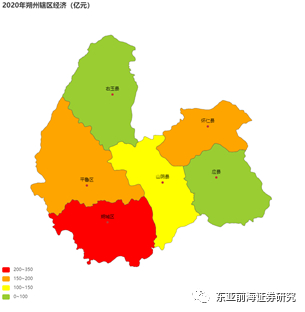从辖区GDP水平来看,晋城市辖区整体经济水平较为均衡,大多区域GDP位于200亿元以上,城区及泽州县经济水平相对较高,为300亿。
