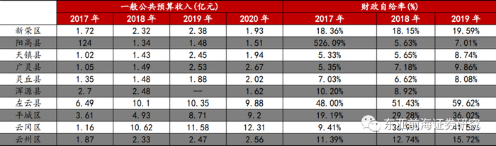 大同市2020年一般公共预算收入为135.04亿元,财政自给率为34.79%。从大同市下辖区财政收入来看,2019年云冈区和左云县一般公共预算收入相对较高,分别为11.58和10.35亿元,大同市辖区内区县财政自给率相差较大。