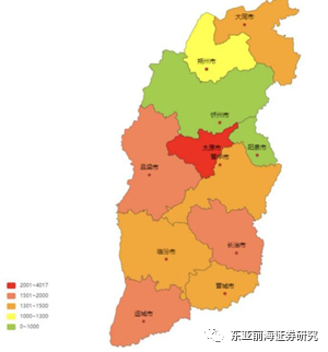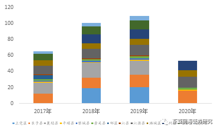 山西省市级平台相对较少且集中于部分城市。在山西11个地级市中仅有太原市、晋城市、大同市、晋中市、朔州市、长治市有市级城投公司,区县级城投公司中有2家位于长治市、1家位于临汾市、1家位于太原开发区。山西省城投平台区域相对集中。