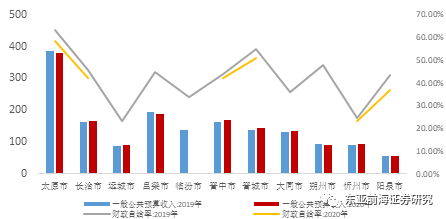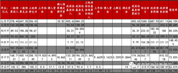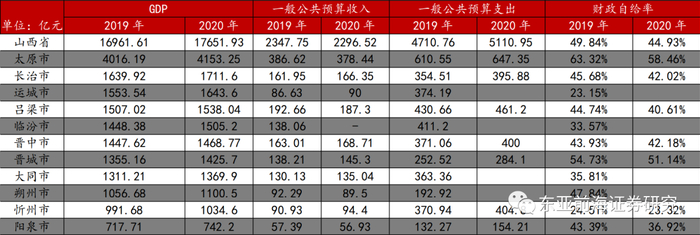 从山西各地财政情况来看,山西各地市财政收入较低,各地级市之间财政自给水平相差较大。满足财政自给率高于全省口径、债务率低于全省口径的地级市仅有太原市与晋城市。