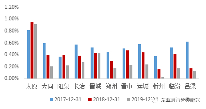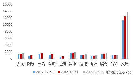 从山西2019年末贷款余额来看,太原市金融机构人民币贷款余额位居第一,2019年为13,707.47,占全省的44.74%,其次为晋中市(2,041.95亿元)、大同市(1,560.12亿元),其余各市贷款余额规模基本在1000亿左右。从山西省内金融资源分布来看,太原金融资源优势明显,其次为晋中市、大同市。