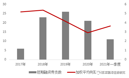 从山西城投企业发行利率来看,由于山西城投发债多以省级与市级平台为主,2018年以来加权发行利率有所下行,但2021年一季度受信用环境影响,加权发行利率上行73BP,略高于全市场国有企业短期融资券发行利率上行幅度(68.34BP)。