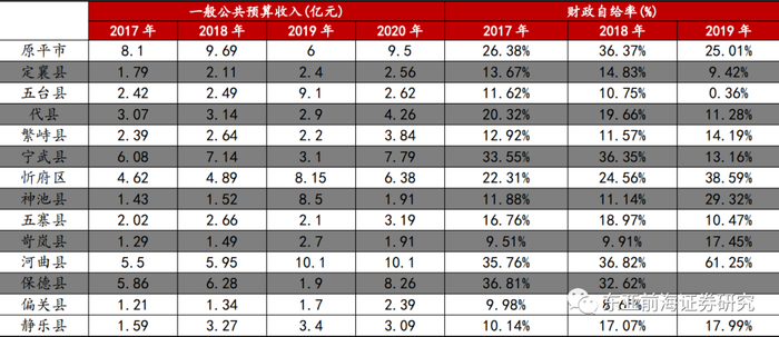 2020年忻州市一般公共预算收入为94.42亿元,政府自给率为23.32%。从忻州市下辖区财政收入来看,忻州市下辖区县财政收入水平一般。2019年河曲县、五台县一般公共预算收入相对较高,分别为10.1和9.1亿元。