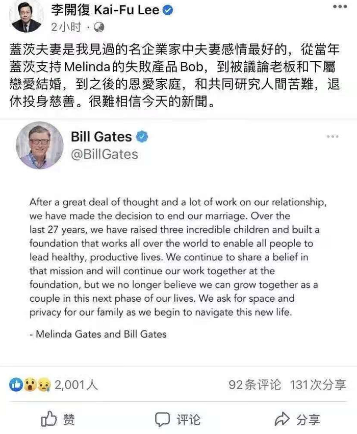 与此同时,创新工场创始人李开复则在社交媒体上写道:“盖茨夫妇是我见过的名企业家中夫妻感情最好的……很难相信今天的新闻。”