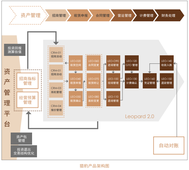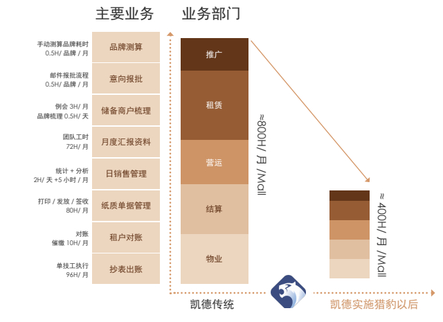 如基于商业管理的工作流程,凯德通过猎豹系统将工作流程梳理成细化的SOP,实现业务线上化,并在各个环节设计了监管及预警机制,确保执行落地。