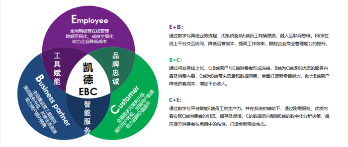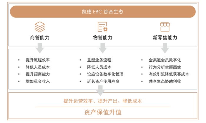 凯德凭借在商业地产的多年经营实践及自身经验,打造出的凯德EBC综合商管生态系统,将运营者(Employee)、商户(BusinessPartner)、消费者(Customer)紧密链接,并运用经验数据化和运营智慧化,帮助业主搭建自身运营能力,以业务在线化帮助业主实现收入提升,从而赋能资产升值。