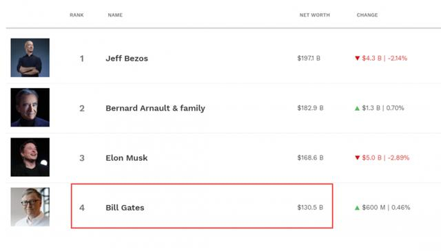 根据福布斯实时富豪榜,截至当地时间5月3日,比尔·盖茨身价达1305亿美元,排名全球第四。
