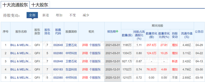截至2021年一季度末,盖茨基金会仍出现在中材科技、卫星石化十大流通股东之列,并较2020年底均增持百万股以上,截至期末其持股数量分别为1334万股、1185万股,持股市值分别为3.11亿元、4.46亿元。