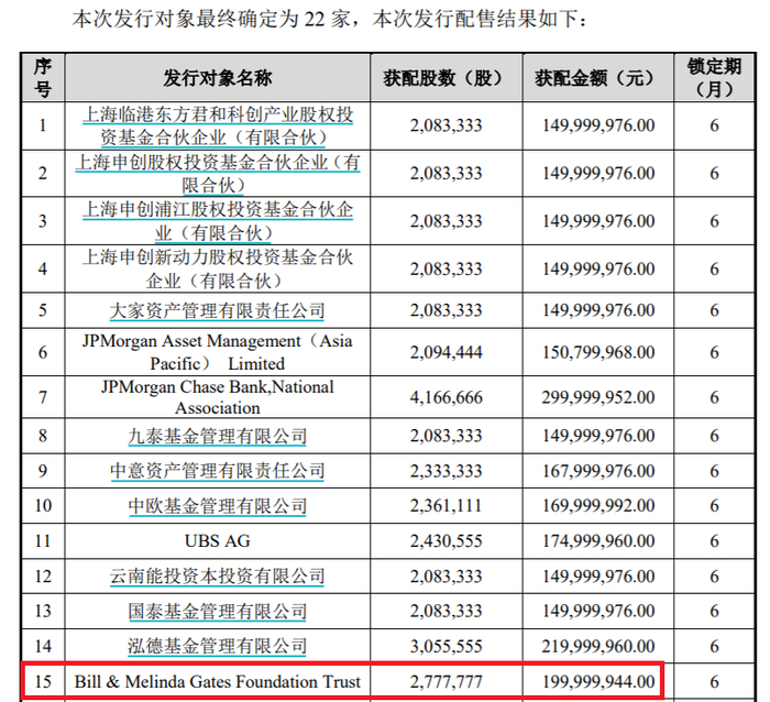 除了投身A股二级市场交易外,盖茨基金会近年来也积极参与一级市场的定增发行。