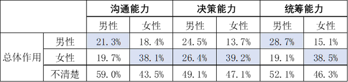 以沟通能力为例,认为男性骨干成员沟通能力更强的被调查者,往往认为总体上男性骨干成员在学生组织中发挥更大作用,这说明沟通能力十分重要。同理,统筹能力也对骨干成员发挥作用有着较大贡献。