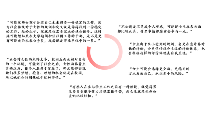另一方面,对于女性而言,大学阶段参与学生组织在某种程度上既是对未来生活的提前适应,也是对未来遗憾的提前预支。长期以来,“稳定”是女性自我发展过程中重要的评判指标。在这种前提下,学生组织一方面因其科层制特征和规则设定被认为是事业单位的“雏形”,女性将其视作提升自我能力、适应未来工作的途径。