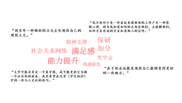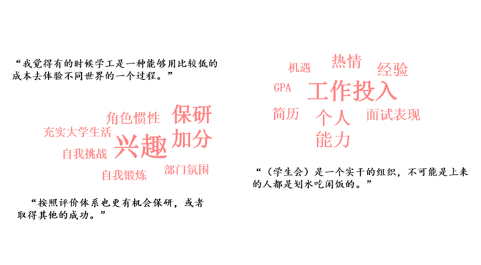 在留任原因方面,几乎所有受访者都强调“兴趣”,也大多指出“保研加分”这一客观需要增强了其留任意愿。在分析自己成功留任的原因时,受访者们认为“工作投入”是最重要的因素。在谈及收获时,“能力提升”和“满足感”被多次提到。