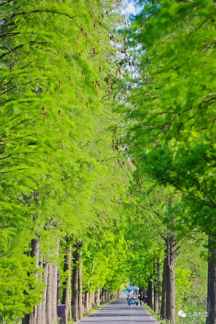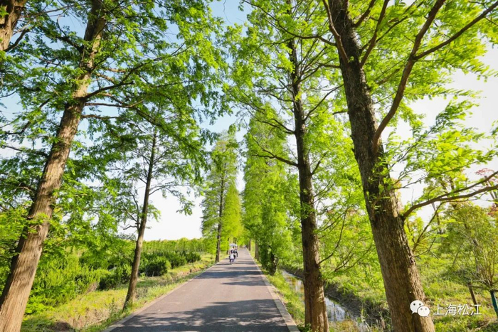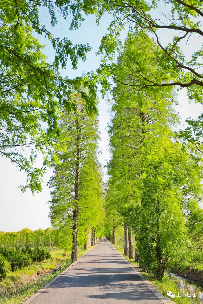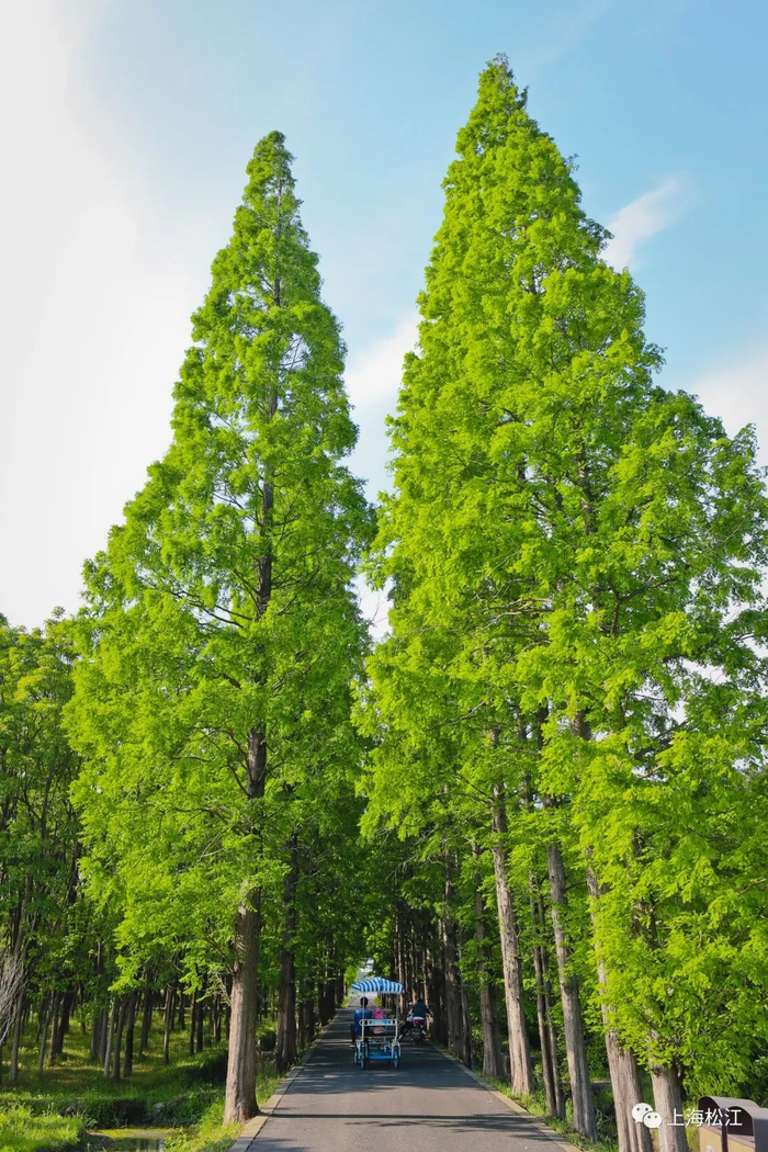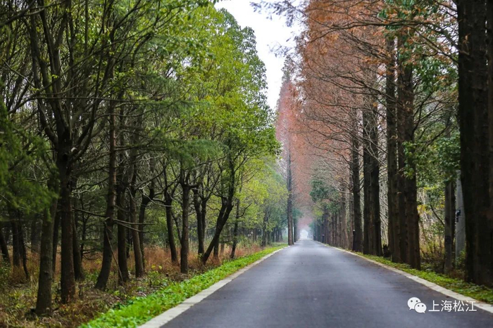 道路两侧高大茂密的水杉林,