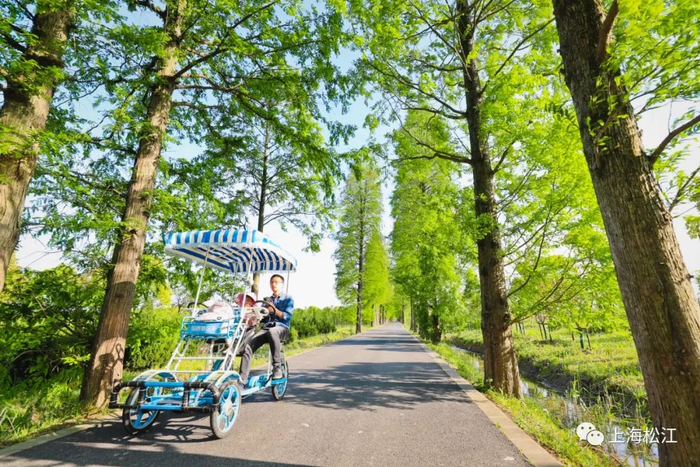 游人骑车穿行林中,