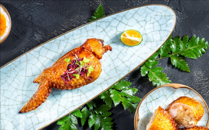 去骨的带皮鸡翅内酿入炒制后的各色鲜味,风干再以清油炸至色泽金红,“龙藏彩凤翼”外“脆”里嫩,与不同口味的蘸酱相互搭配,相得益彰。