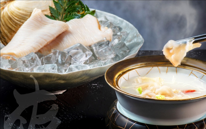 特别烹制的象拔蚌搭配精心熬煮白粥,撒上翠绿的葱花点缀,咸鲜的“毋米粥水灼象拔蚌片”脆“爽”可口,令人垂涎欲滴。