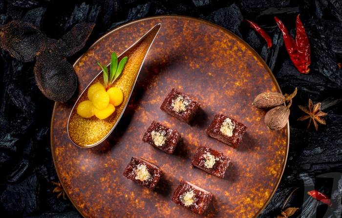 选用顶级雪花和牛,融入广东新会的远年陈皮,以粤式古法叉烧制法,加入秘制的叉烧酱汁,经过炭炉烧制45分钟,色泽红亮,外焦香肉质肥香润口,口味咸鲜香甜,陈皮香味雅致。