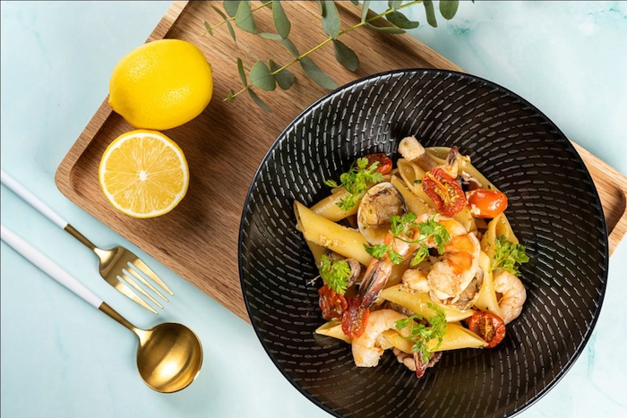 与至亲好友共同分享佳肴一直是意大利人传统的生活方式之一。这道浇覆着白酒汁的海鲜粗管面份量十足,上桌后香味扑鼻,丰富的食材即映入眼帘,包含蛤蜊、青口贝、老虎虾、扇贝等。与龙虾酱共同烹煮后更为鲜美,意式斜管面饱吸汤汁浓郁且略带较劲,色泽诱人,口感愈加丰富。