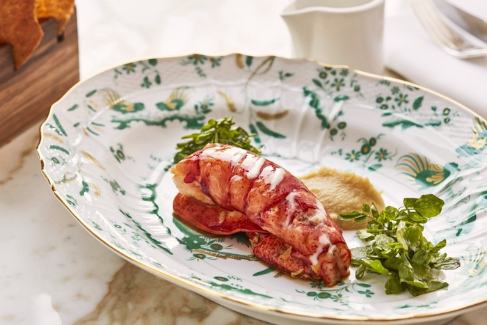 蒸蓝龙虾,搭配鹰嘴豆泥、龙虾汁及菊苣