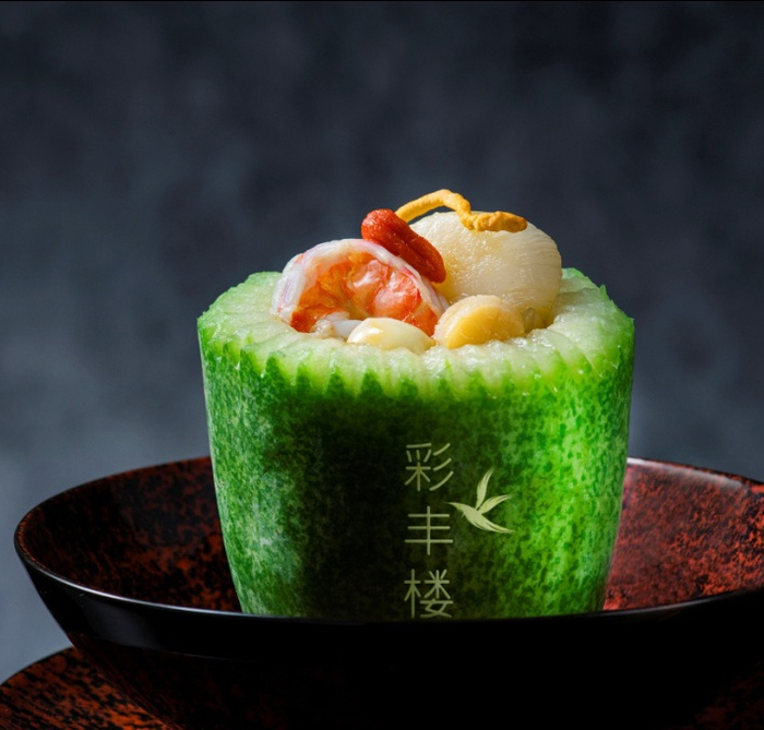 翠玉般色泽的迷你瓜盅与瑶柱、带子、虫草花、松茸等一同炖煮,汤清味淡回味甘甜,一个经典的传统粤式名肴。