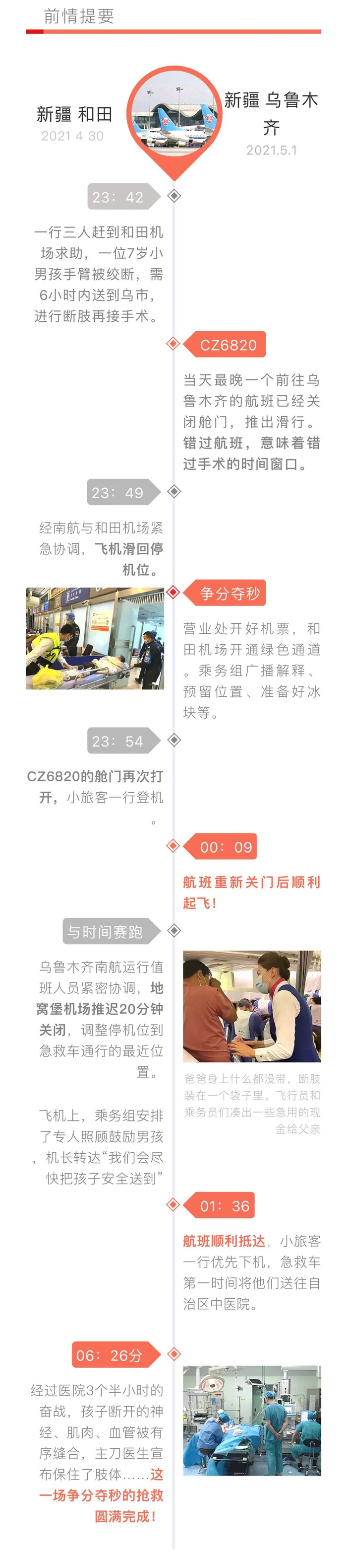 五一期间,为救助一名断臂男孩,为他赢得“黄金时间”接臂,南航航班延后起飞,返回廊桥“二次开门”。医护、机组、机场和101名乘客通力协作,开展了一场与时间赛跑的紧急抢救,牵动了亿万网友的心。