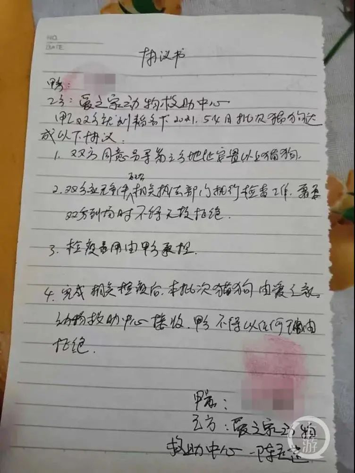 爱之家义工向记者展示了一份协议书,涉事宠物店店主与爱之家动物救助中心达成协议,双方将另外寻找第三方地址安置该批小猫小狗,双方将无条件配合相关执法部门执行检疫工作,检疫费用将由宠物店店主承担,完成检疫后猫狗由爱之家接收。