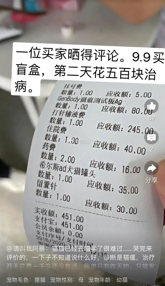 更有网友称,9.9元买的盲盒,因为收到的小猫有猫瘟,治疗费用接近500元。