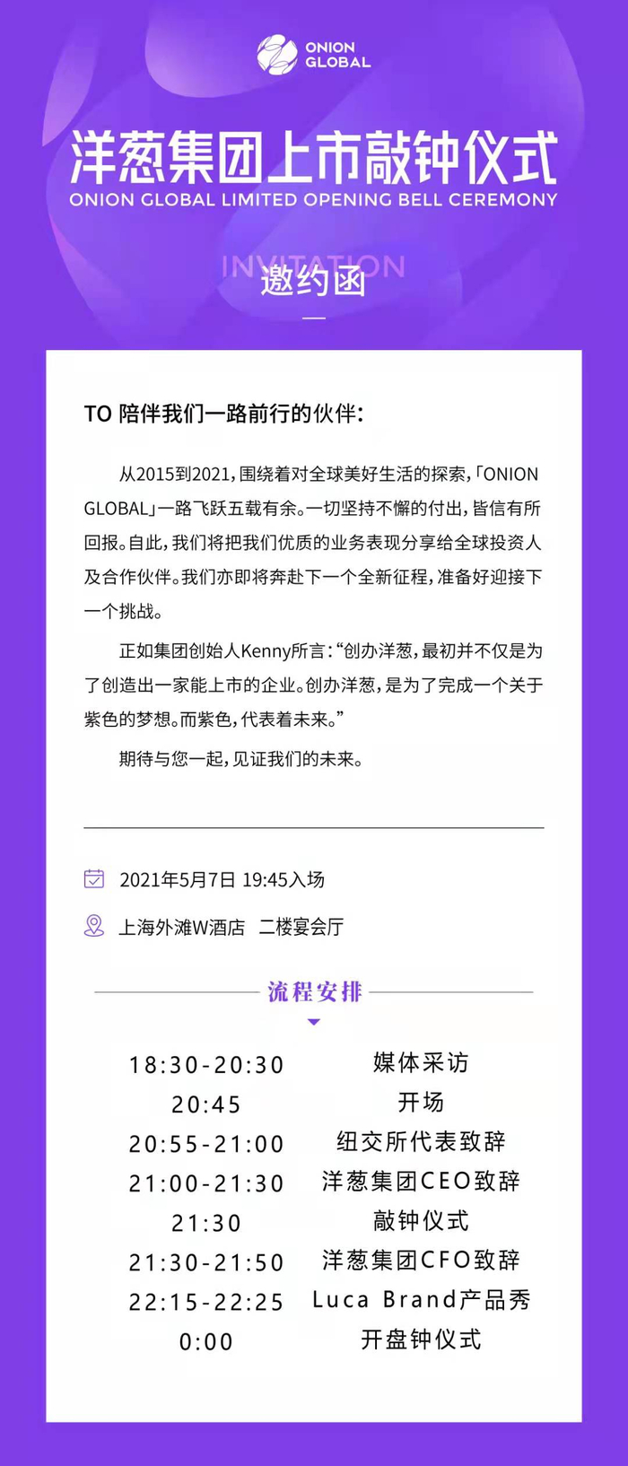 五一假期富凯IPO财经集体出游其乐融融,5月3日富凯IPO财经收到一张邀请函内容信息量比较大。《洋葱集团上市敲钟仪式》-邀请函,根据邀请函显示18点30分-20:30分为媒体采访环节具体采访内容不详。