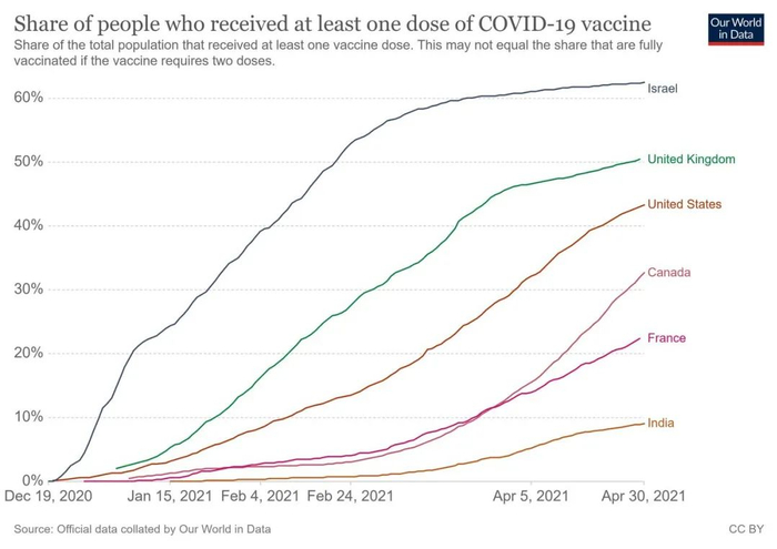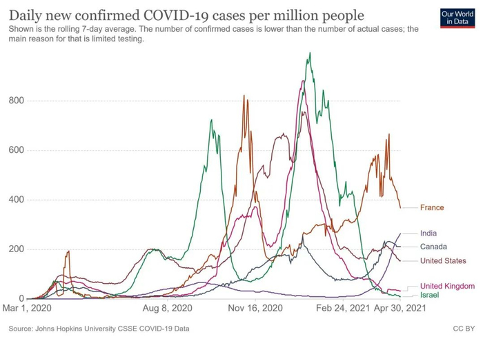 全球主要疫情国家人均每日新病例排名。相比之下,疫苗接种率高的以色列和英国的新增病例,明显少于疫苗注射率低的法国和加拿大。印度的病例数更是大幅上升。