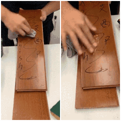 我们在实木地板上用油性马克笔写了几个字,用抹布试了试,根本擦不掉。