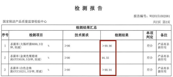 经第三方机构检测,对金黄色葡萄球菌、大肠杆菌、白色念珠菌的抑制率高于94%。