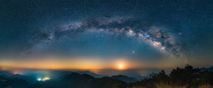 在太子尖观景台欣赏银河拱桥与月升。