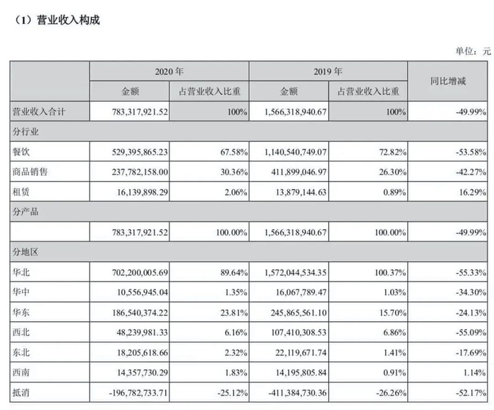 年报显示,2020年全聚德餐饮业务营收5.29亿元,同比下降53.58%。按照地区划分,华北地区的营收占比为89.64%,而2019年为100.37%。
