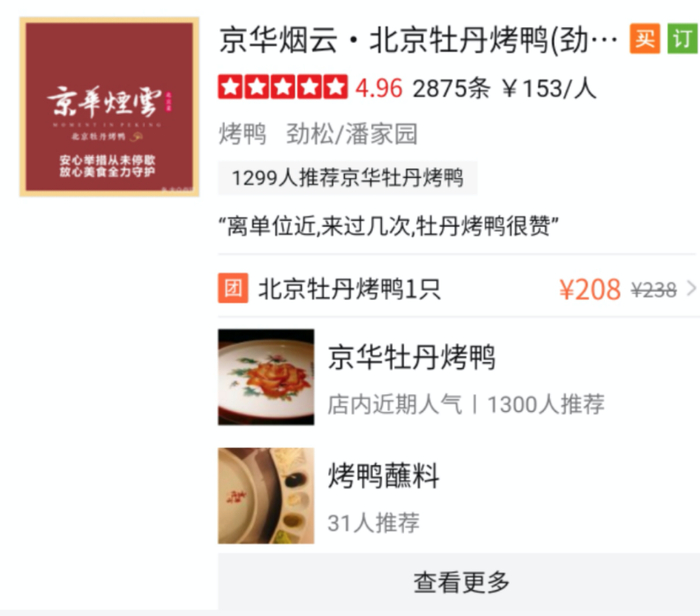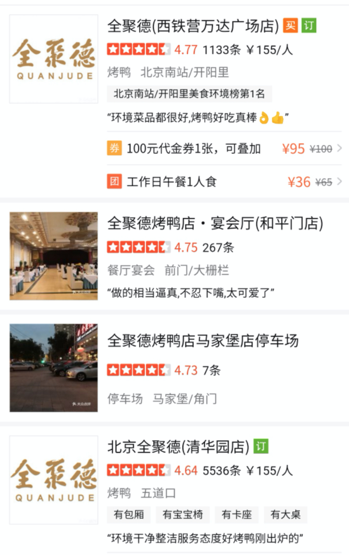 在大众点评上,排名比较靠前的是京华烟云、四季民福等店,都在4.9分以上,而全聚德排名相对靠前的西铁营万达广场店只有4.77分,并没有十分出众。